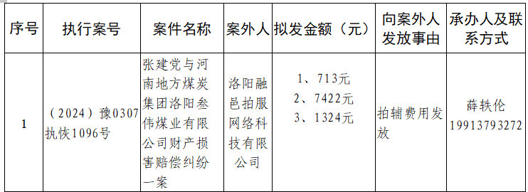 特别提示:公示期满3个自然日后,如无当事人提出异议,则该案款将向案外人发放,监督电话:0379-63157288
