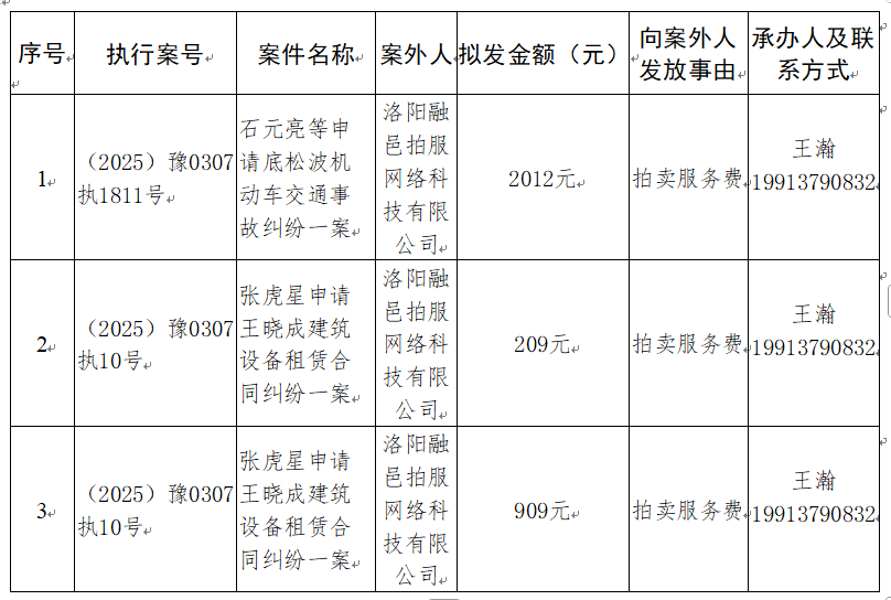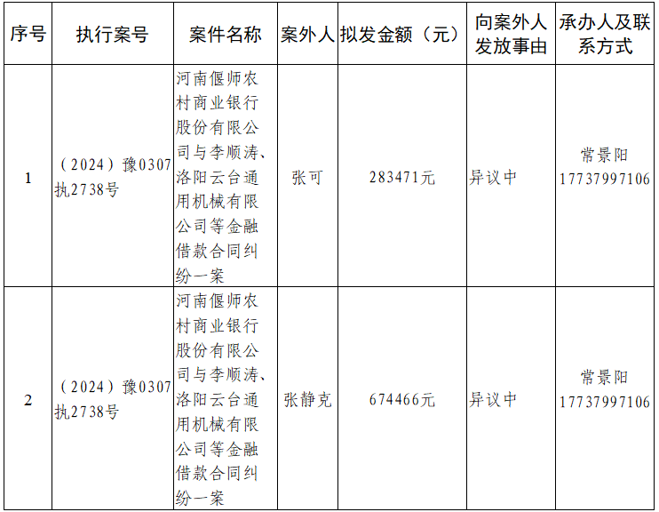 特别提示:公示期满3个自然日后,如无当事人提出异议,则该案款将向案外人发放,监督电话:0379-63157288