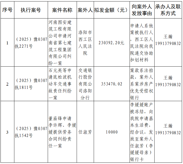 为进一步规范执行案款收发、管理,完善执行案款管理工作,维护当事人合法权益,防患廉政风险,现将河南省洛阳市偃师区人民法院拟向案外人发放的案款公示如下: