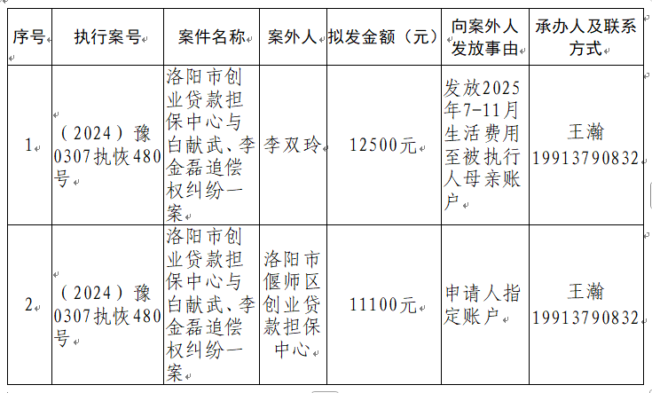 特别提示:公示期满3个自然日后,如无当事人提出异议,则该案款将向案外人发放,监督电话:0379-63157288