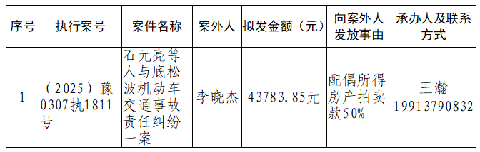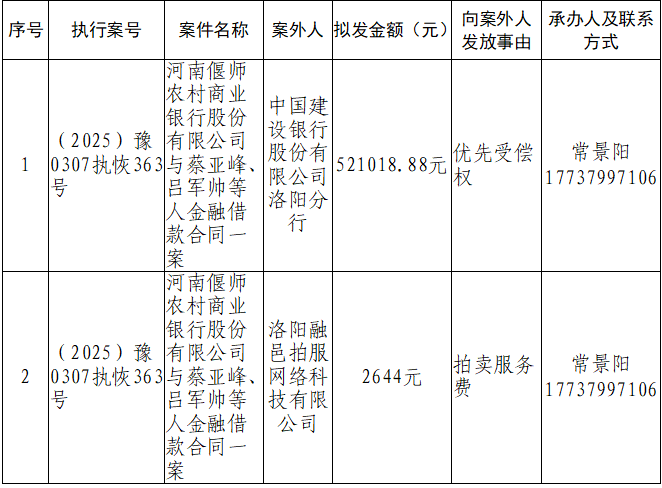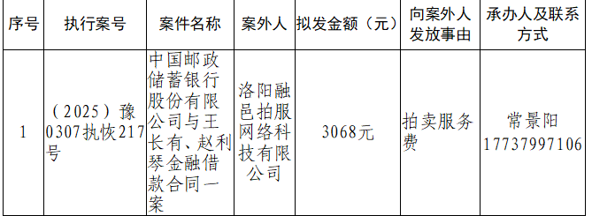 特别提示:公示期满3个自然日后,如无当事人提出异议,则该案款将向案外人发放,监督电话:0379-63157288
