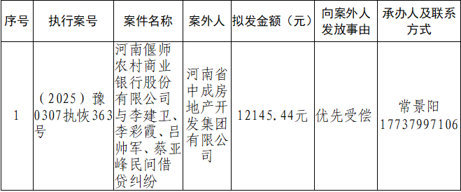 特别提示:公示期满3个自然日后,如无当事人提出异议,则该案款将向案外人发放,监督电话:0379-63157288