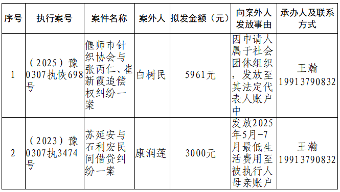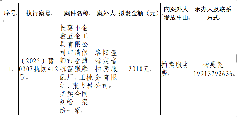 特别提示:公示期满3个自然日后,如无当事人提出异议,则该案款将向案外人发放,监督电话:0379-63157288