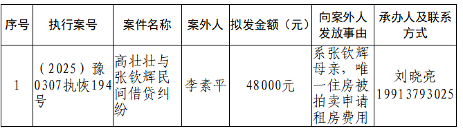 特别提示:公示期满3个自然日后,如无当事人提出异议,则该案款将向案外人发放,监督电话:0379-63157288