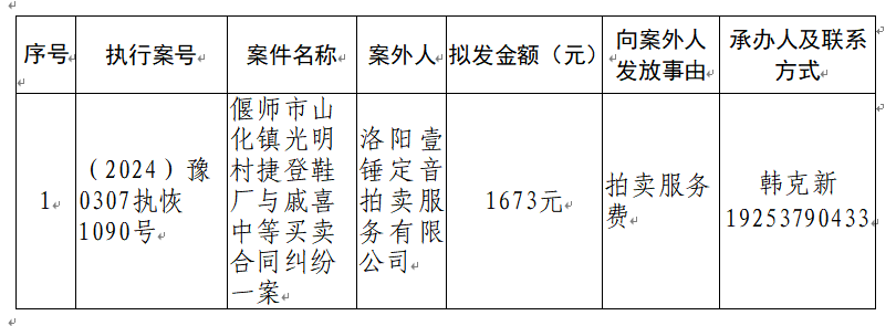 为进一步规范执行案款收发、管理,完善执行案款管理工作,维护当事人合法权益,防患廉政风险,现将河南省洛阳市偃师区人民法院拟向案外人发放的案款公示如下:
