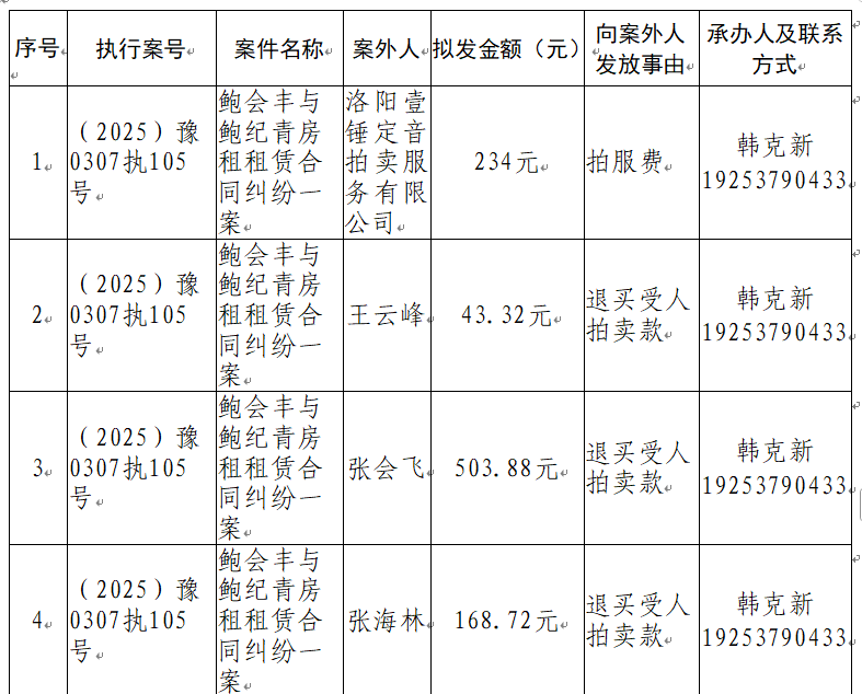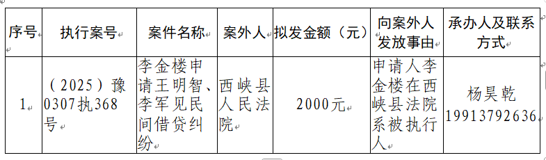 特别提示:公示期满3个自然日后,如无当事人提出异议,则该案款将向案外人发放,监督电话:0379-63157288
