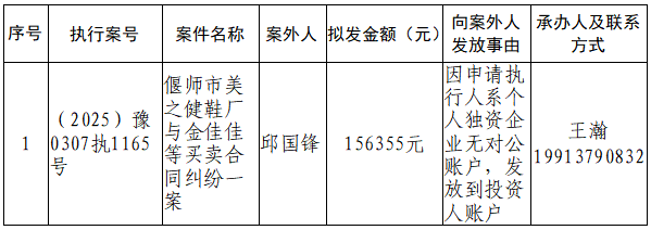 特别提示:公示期满3个自然日后,如无当事人提出异议,则该案款将向案外人发放,监督电话:0379-63157288