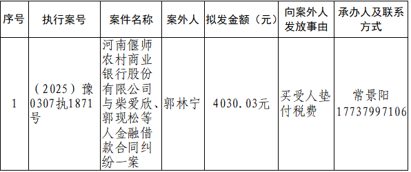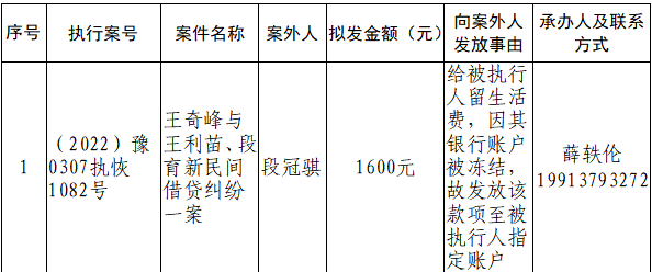 特别提示:公示期满3个自然日后,如无当事人提出异议,则该案款将向案外人发放,监督电话:0379-63157288