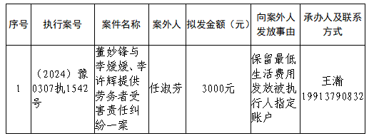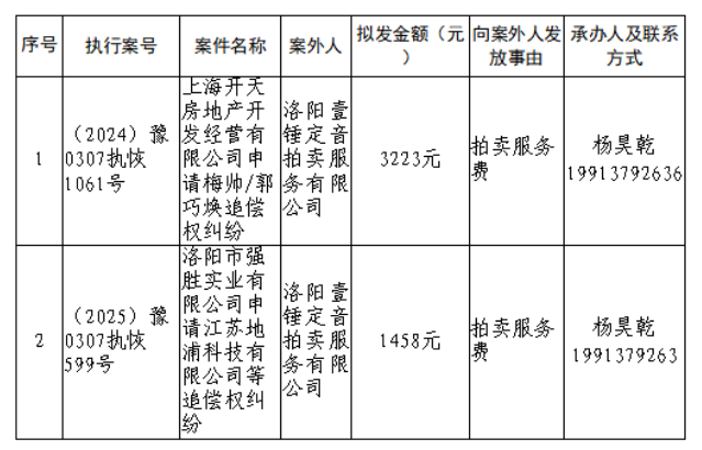 特别提示:公示期满3个自然日后,如无当事人提出异议,则该案款将向案外人发放,监督电话:0379-63157288