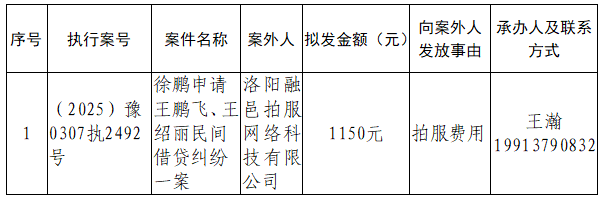 特别提示:公示期满3个自然日后,如无当事人提出异议,则该案款将向案外人发放,监督电话:0379-63157288