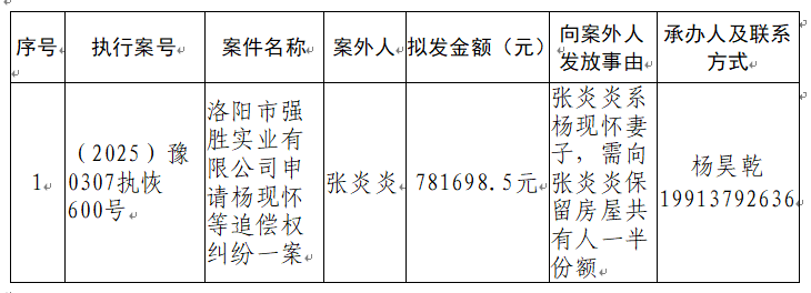 特别提示:公示期满3个自然日后,如无当事人提出异议,则该案款将向案外人发放,监督电话:0379-63157288