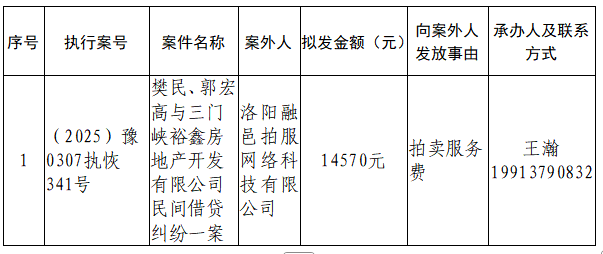 特别提示:公示期满3个自然日后,如无当事人提出异议,则该案款将向案外人发放,监督电话:0379-63157288
